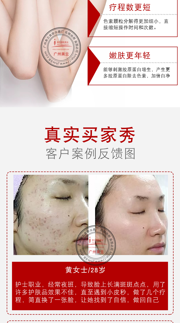 01 755皮秒速度快,爆破能力強(qiáng),可以將其黑色素瞬間擊碎成細(xì)沙狀態(tài)。療程短,高效,不返黑,更安全。如雀斑、老年斑、咖啡斑、褐青色斑、太田痣等。皮秒1064的FOCUS技術(shù)使500mj的能量聚焦,比傳統(tǒng)調(diào)Q激光提高了10倍,能將色素震碎成極細(xì)小的顆粒,更方便機(jī)體對(duì)色素的代謝,大大提高了黃褐斑的祛除率。