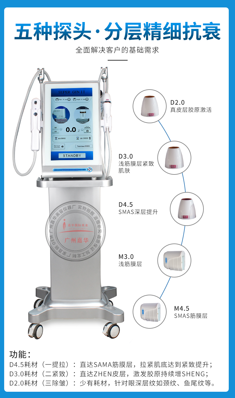 1分層抗衰:3大深度,5種治療頭,實(shí)現(xiàn)真皮、淺筋膜層與SMAS筋膜層精準(zhǔn)分層抗衰