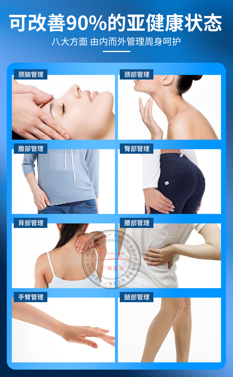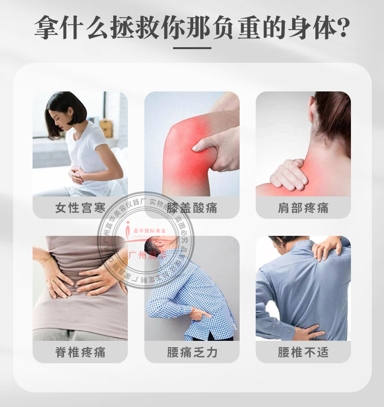 作用于全身14個部位:腳膝關節(jié)、面部、手臂、頸部、淋巴、頸椎、臀部、胸部脊椎、腰部、腹部、大腿、私密等部位。溫熱效應,增強血液循環(huán),加強代謝。滲透效應,可影響血流量,加速血液循環(huán)及膠原合成加速。