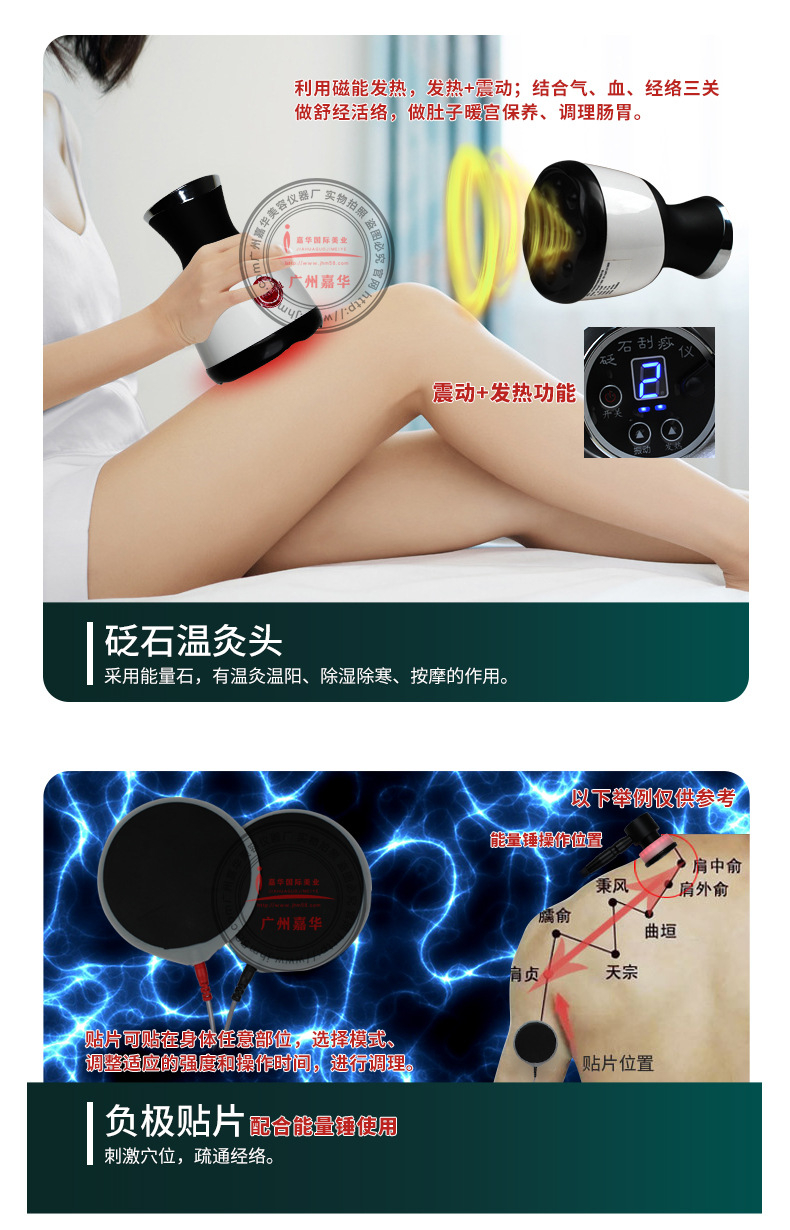 砭石溫灸頭:利用磁能發(fā)熱,疏通全身經(jīng)絡(luò),溫灸溫陽、除濕除寒、震動(dòng)按摩