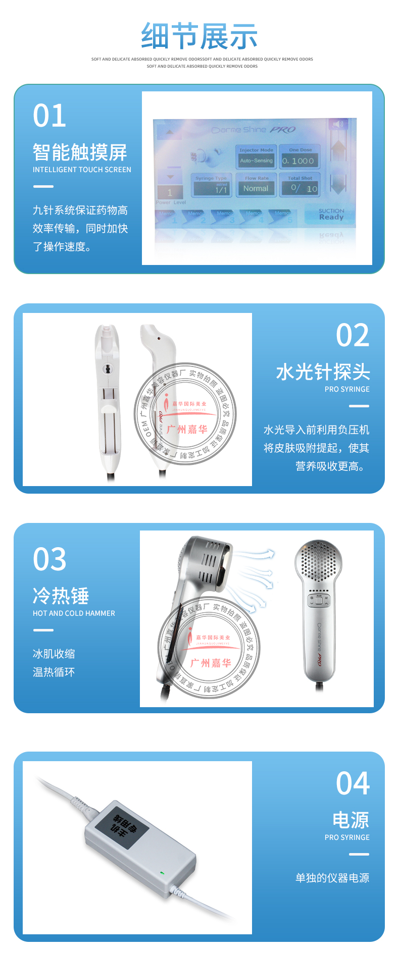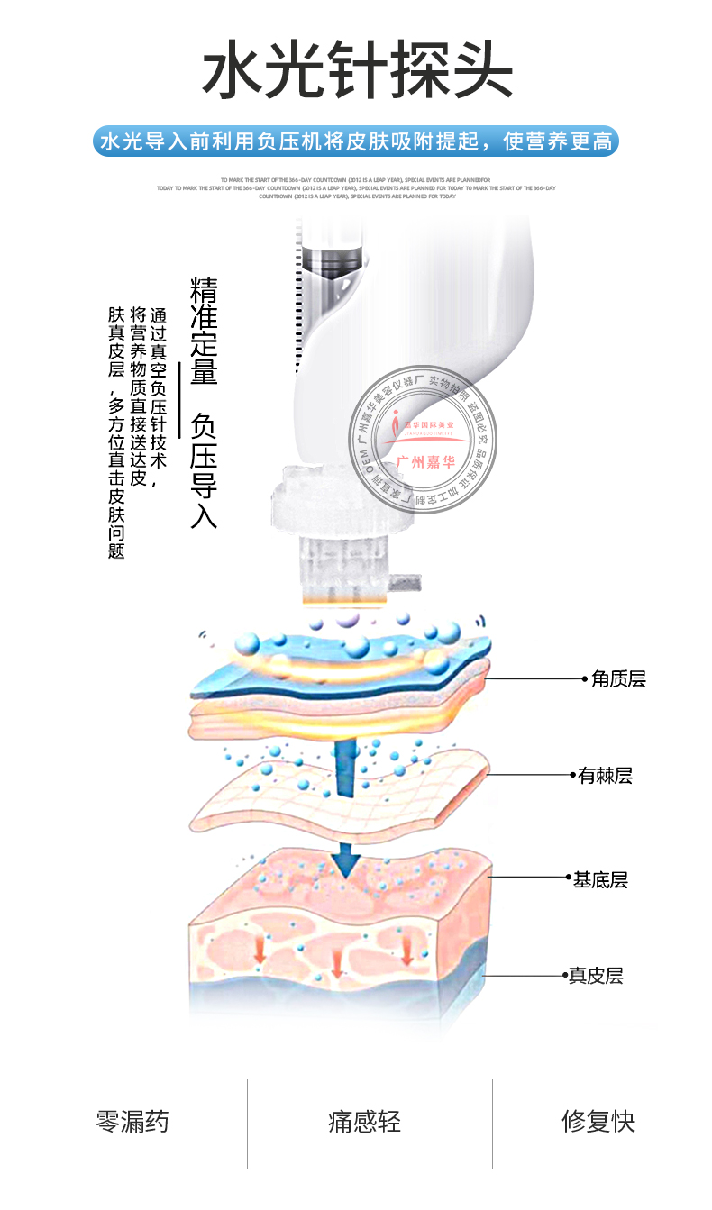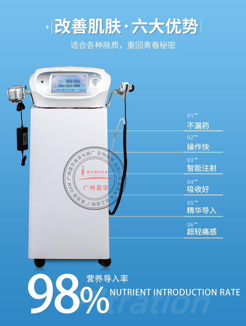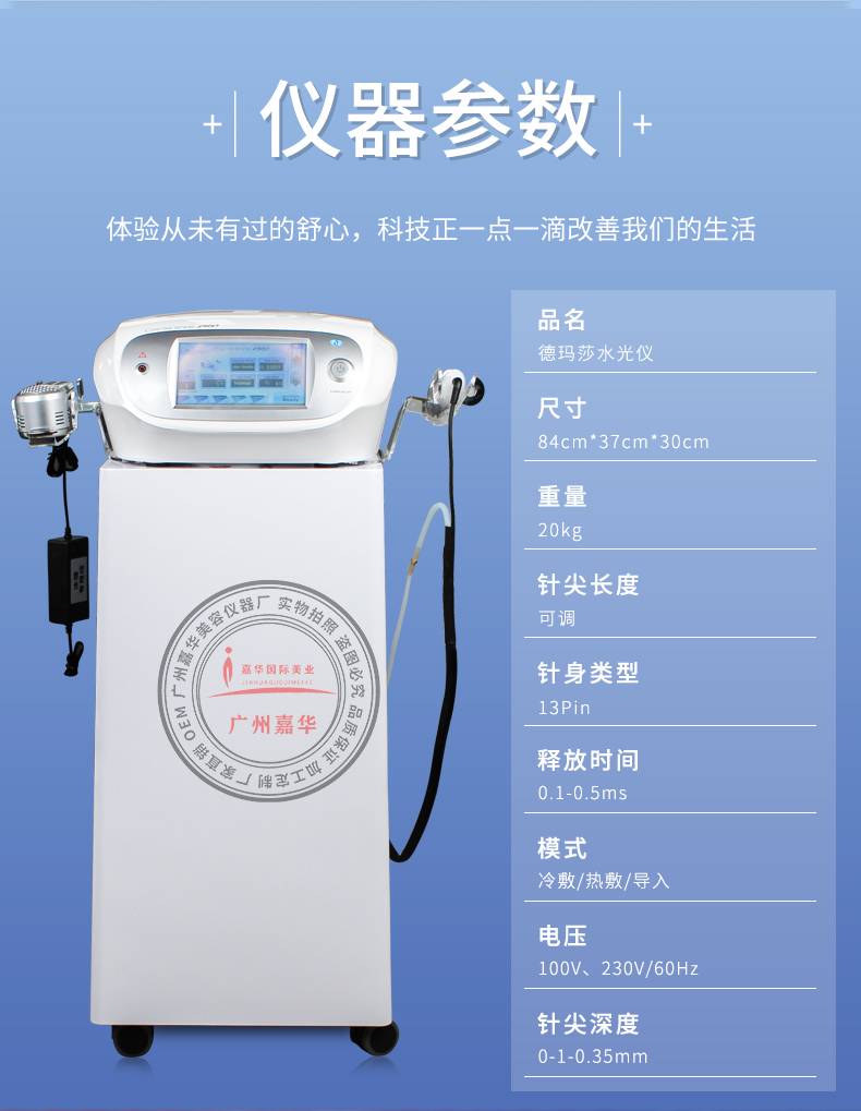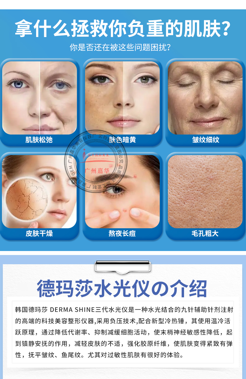 韓國(guó)德瑪莎三代水光儀是一種水光結(jié)合的九針輔助針劑注射的高端的科技美容整形儀器,采用負(fù)壓技術(shù),配合新型冷熱錘,其使用溫冷活躍原理,通過降低代謝率、抑制減緩細(xì)胞活動(dòng),使末梢神經(jīng)敏感性降低,起到鎮(zhèn)靜安撫的作用,減輕皮膚的不適,強(qiáng)化膠原纖維,使肌膚變得緊致有彈性,撫平皺紋、魚尾紋。尤其對(duì)過敏性肌膚有很好的體驗(yàn)。