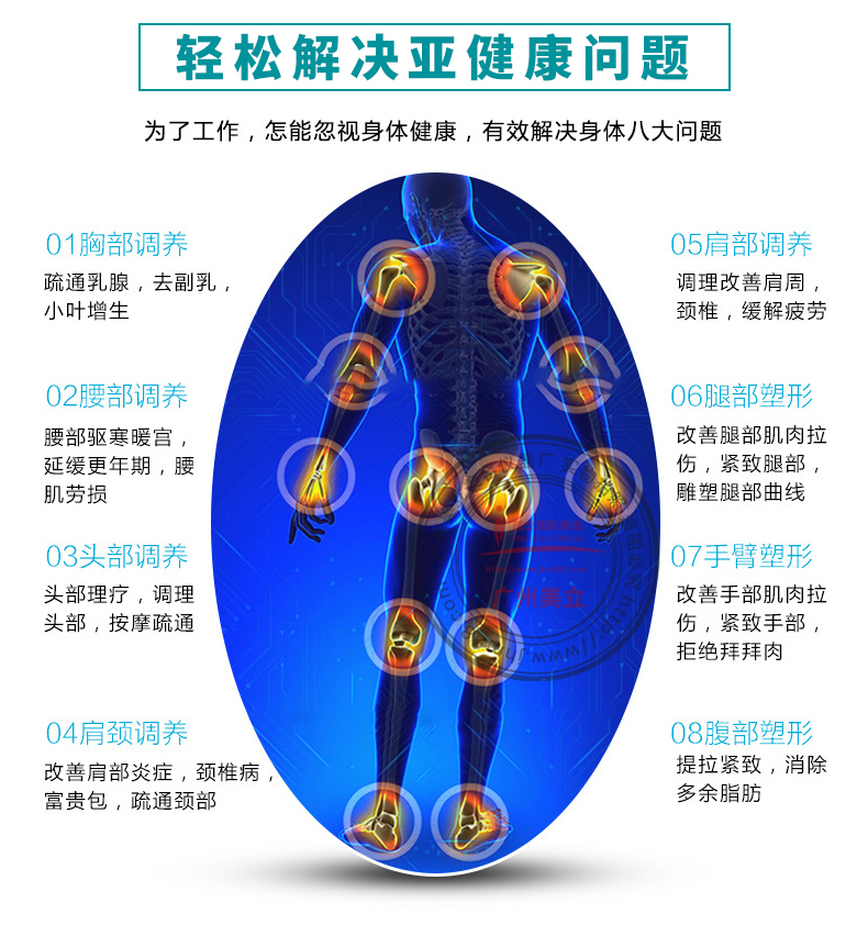 輕松解決亞健康問題 為了工作,怎能忽視身體健康,有效解決身體八大問題01胸部調(diào)養(yǎng)02肩部調(diào)養(yǎng)03腰部調(diào)養(yǎng) 04腿部塑形05頭部調(diào)養(yǎng)06手臂塑形07肩頸調(diào)養(yǎng) 08腹部塑形